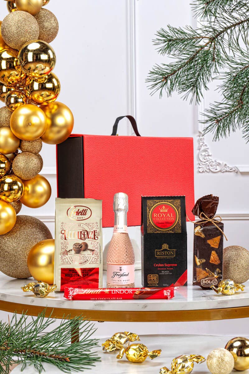 - W skład zestawu wchodzą wyłącznie produkty wymienione w opisie. Kieliszki, bombki, dekoracje oraz talerze widoczne na zdjęciach służą wyłącznie jako element aranżacji i nie są częścią prezentu.