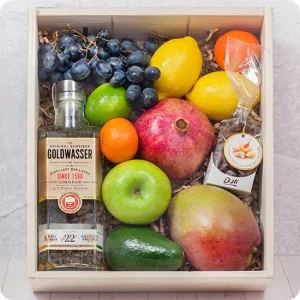 Skrzynka owoców z Goldwasserem to ekskluzywny zestaw, który łączy w sobie wyjątkowe owoce, luksusową wódkę oraz zmysłowe połączenie orzechów nerkowca w czekoladzie z delikatnym akcentem chilli. To prawdziwa uczta dla podniebienia i zmysłów, zamknięta w stylowej drewnianej skrzynce. W tej pełnej smaków kompozycji znajdują się winogrona, granat, mango, cytryny, jabłko, awokado, limonki i mandarynki. Każdy z owoców został starannie wyselekcjonowany, by dostarczyć maksymalnej świeżości, soczystości i bogactwa smakowego. To paleta smaków, która zaspokoi gusta nawet najbardziej wymagających smakoszy. W skrzynce znajduje się także wódka ze złotem Goldwasser, znana ze swojego wyjątkowego składu zawierającego prawdziwe złote płatki. Ta luksusowa wódka z nutą korzenną stanowi doskonałe dopełnienie owocowego doznania, dodając elegancji i wyjątkowego charakteru. Dodatkowym elementem tego ekskluzywnego zestawu są orzechy nerkowca w czekoladzie z chilli. To niezwykłe połączenie słodyczy, chrupkości orzechów i delikatnej ostrości chilli, które pobudzi zmysły i zaostrzy apetyt na kolejne smaki. Skrzynka owoców z Goldwasserem to nie tylko zbiór smaków, ale także wyrafinowany prezent, który doskonale sprawdzi się jako upominek na różne okazje, od jubileuszy po wyjątkowe spotkania. To połączenie luksusu, świeżości i smaków, które z pewnością zostaną docenione przez miłośników wyjątkowych doznań kulinarnej przyjemności.